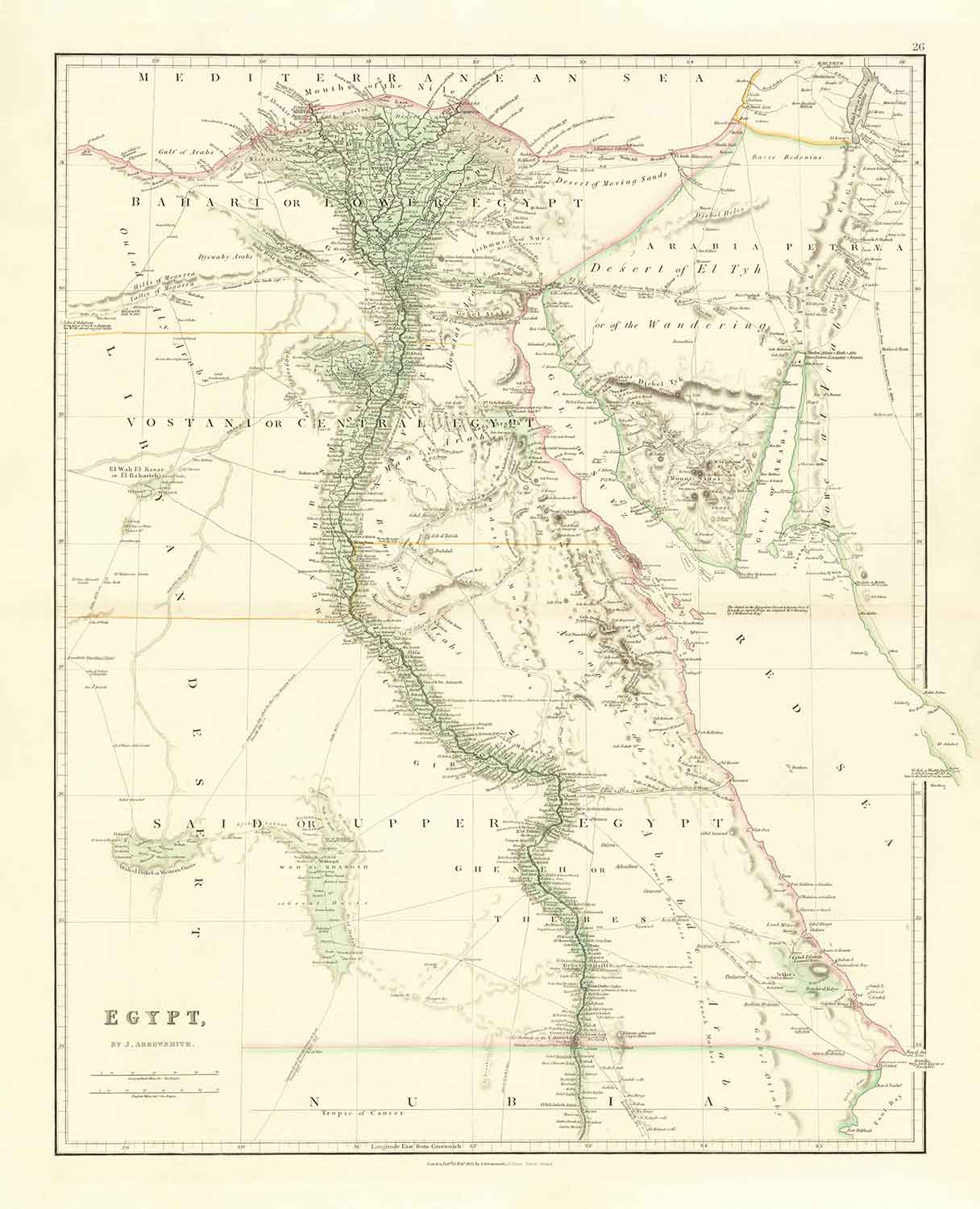 Un hermoso mapa de Egipto, publicado originalmente en 1832 por probablemente el cartógrafo más buscado de mediados del siglo XIX, John Arrowsmith.
