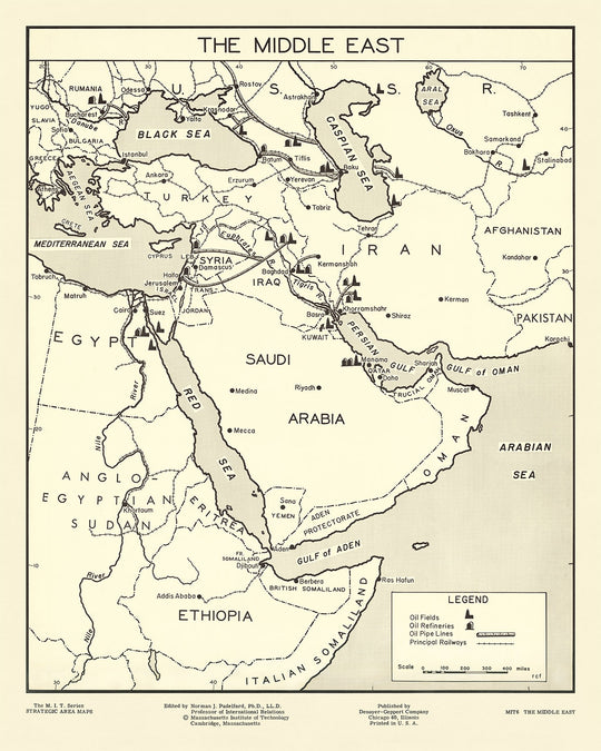 Adéntrese en el rico tapiz histórico de Oriente Medio con este mapa meticulosamente elaborado de 1950, creado por el estimado Norman J. Padelford, Ph.D., LL.D., profesor de Relaciones Internacionales en el MIT. Este mapa es parte de la serie de mapas de áreas estratégicas del Instituto Tecnológico de Massachusetts, diseñado para educar a los estudiantes sobre los paisajes geopolíticos y económicos de regiones críticas. Captura las etapas incipientes de la industria petrolera de Oriente Medio, un sector que pronto se convertiría en una piedra angular de la producción de energía global y las relaciones internacionales.