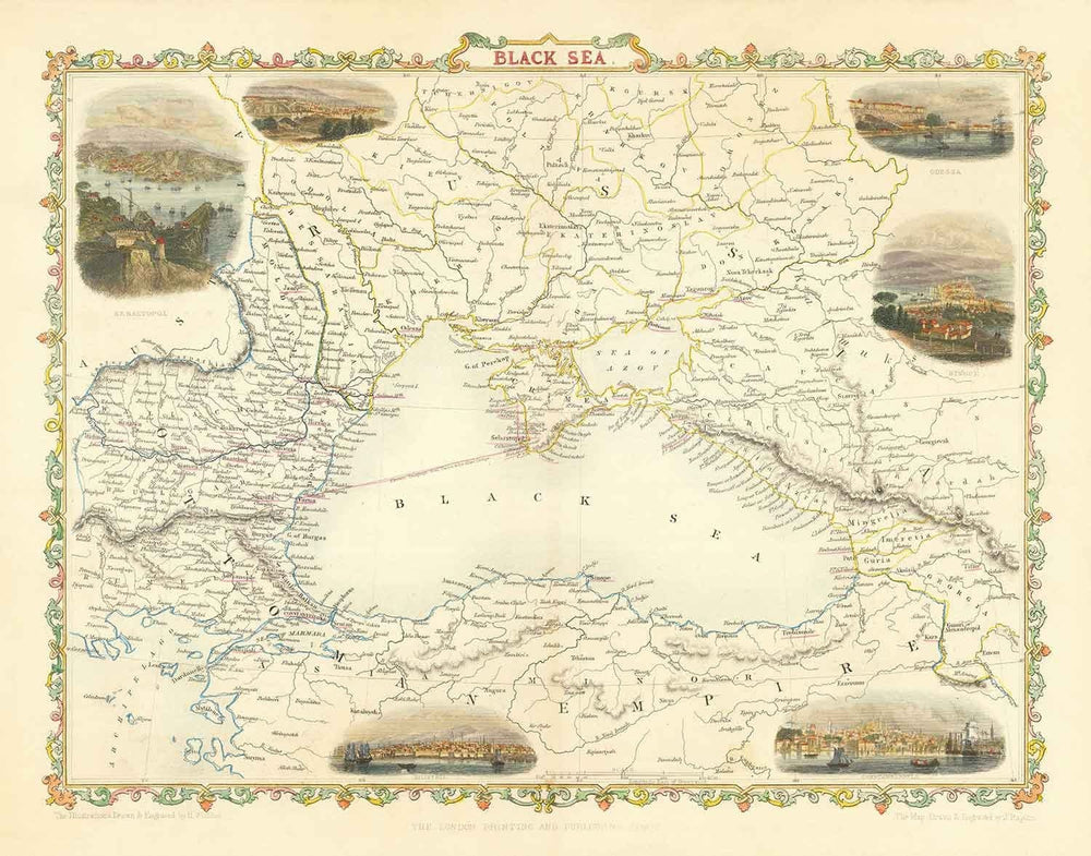 Grabado por John Rapkin y publicado por J. Tallis & Co en 1854, este es uno de los mapas históricos más finos y detallados de la región del Mar Negro, con Europa a la izquierda y Asia a la derecha.