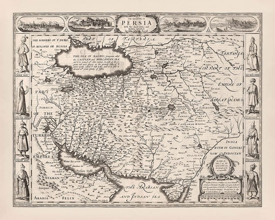 El diseño artístico del mapa se ve realzado por las ilustraciones de personajes con atuendos tradicionales y vistas panorámicas de ciudades como Ormus y Tabriz. Estos adornos añaden una capa de riqueza cultural, proporcionando contexto y profundidad a la información geográfica. Los elementos decorativos del mapa no son meramente ornamentales; sirven para atraer al espectador, invitándolo a explorar los intrincados detalles y las narraciones históricas incrustadas en la cartografía. Este mapa de Persia es un testimonio del arte y la experiencia de John Speed, y ofrece una visión atemporal de una era pasada.