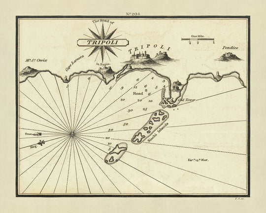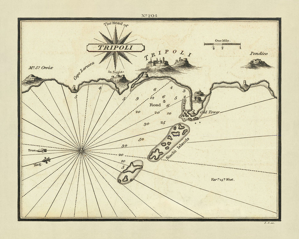 El mapa de Heather es un tesoro de conocimiento marítimo, detallando sondeos, ayudas a la navegación y matices topográficos a lo largo de la costa de Trípoli. La inclusión de varios hitos naturales y artificiales como las Islas Shachi, la Vieja Torre y varias fortificaciones, mejora su utilidad y valor histórico. Cada característica está finamente grabada, un sello del compromiso de Heather con la precisión y claridad en la cartografía marítima. Este mapa no solo sirvió como una herramienta crítica para los navegantes del siglo XIX, sino que ahora sirve como un fascinante documento histórico para coleccionistas y académicos por igual.