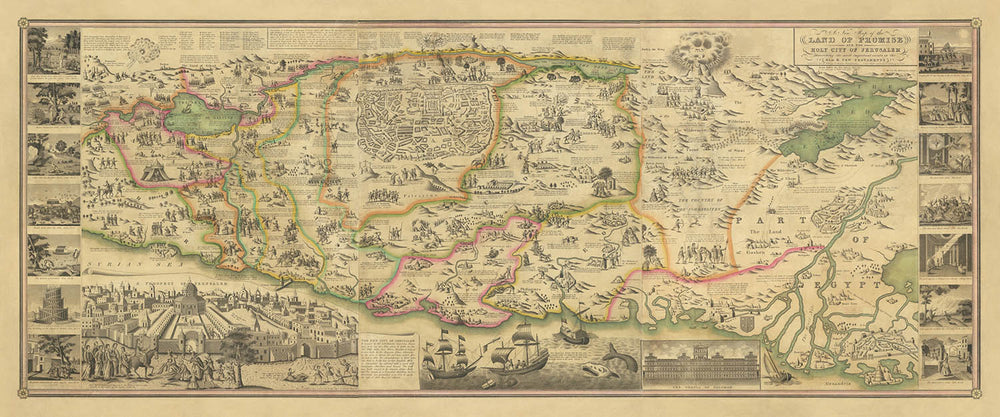 Step into the sacred geography of antiquity with "A New Map of the Land of Promise And the Holy City of Jerusalem," a masterwork of cartographic artistry and biblical storytelling, engraved by D. Haines in 1828. This rare American wall map, with only a handful of known institutional examples, offers a sweeping bird’s-eye perspective of the Holy Land, extending from the storied banks of the Nile and the Red Sea to the ancient cities of Damascus and Sidon. At its heart lies Jerusalem, meticulously rendered and celebrated as the spiritual epicenter of the Abrahamic faiths. The map’s design is not merely geographical—it is a visual tapestry, interweaving sacred history with the landscape itself.