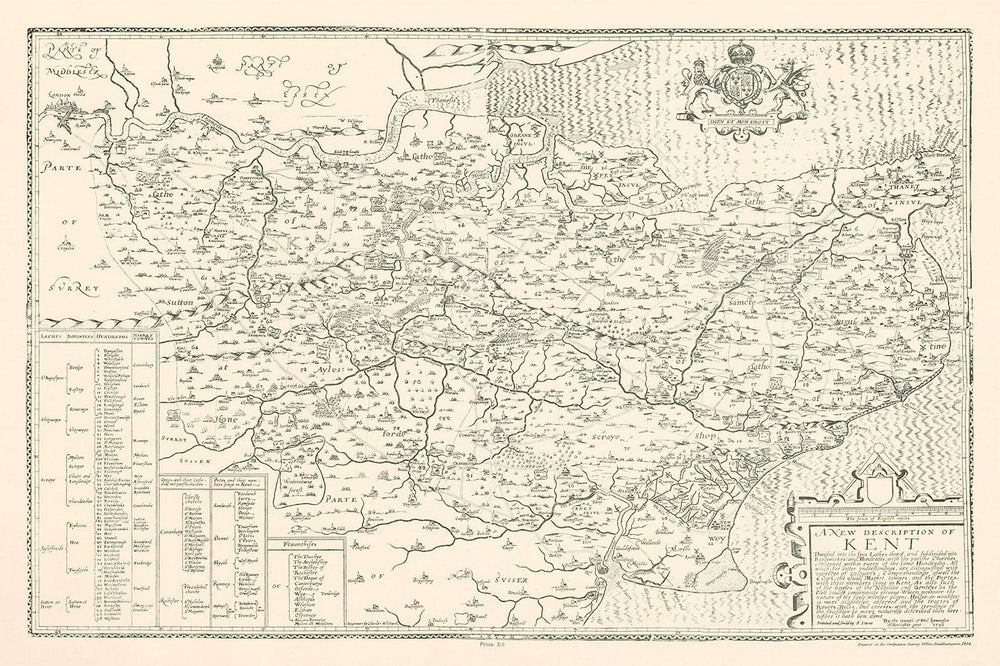 Un mapa verdaderamente maravilloso de Kent basado en los viajes de Philip Symonson en 1596 y grabado por Charles Whitwell. Lo realmente asombroso es cómo casi todas las ciudades, pueblos y aldeas de Kent ya existían en 1596. Está Canterbury, Dover, Rye, Tunbridge y Thanet, por supuesto, pero también aldeas como Edenbridge, Hever, Orpington y Maidstone (o Maydston como se escribía en ese entonces).