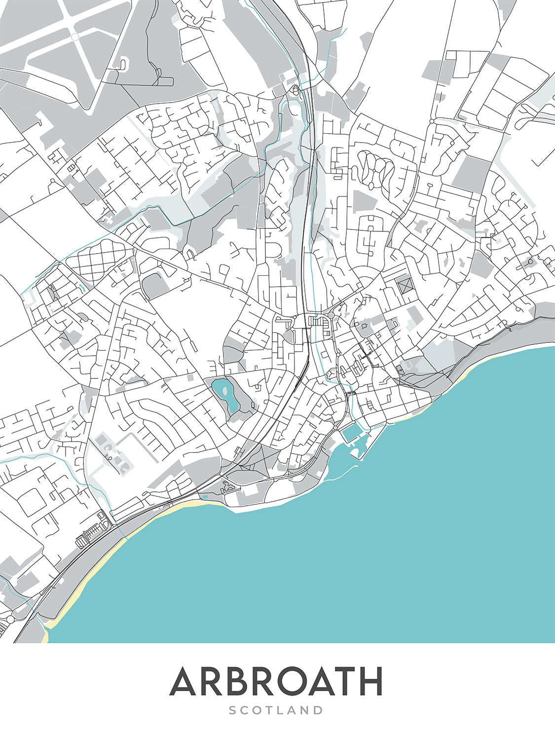 Los hitos significativos, como la histórica Abadía de Arbroath y el pintoresco Parque Victoria, están sutilmente integrados en el diseño del mapa, añadiendo capas de interés y contexto. Los intrincados patrones de calles alrededor del Puerto de Arbroath y los amplios espacios verdes del Parque West Links se capturan con precisión, reflejando la mezcla de belleza histórica y natural de la ciudad. Este mapa no solo es una celebración de la geografía física de Arbroath, sino también un homenaje artístico a su patrimonio cultural.