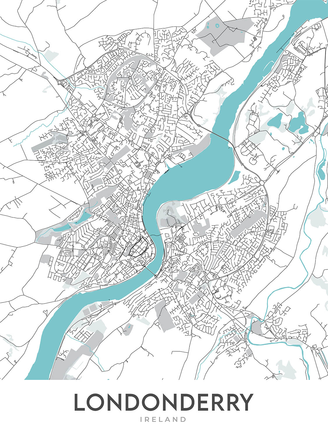 Mapa moderno de la ciudad de Londonderry, Irlanda del Norte: Bogside, Brandywell, Puente Craigavon, Puente Foyle, Guildhall