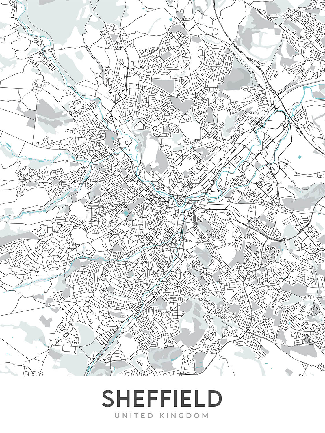 Este mapa de Sheffield es un mapa moderno y detallado de las calles, centrado en el centro de la ciudad y sus áreas circundantes. Presenta una cartografía única, un diseño moderno y una paleta de colores llamativa, lo que lo convierte en una pieza de arte elegante e informativa para cualquier hogar u oficina. El mapa cubre una amplia gama de vecindarios, incluyendo el centro de la ciudad, Broomhill, Crookesmoor, Nether Edge, Sharrow, Walkley, Hillsborough, Ecclesall, Whirlow y Stannington.