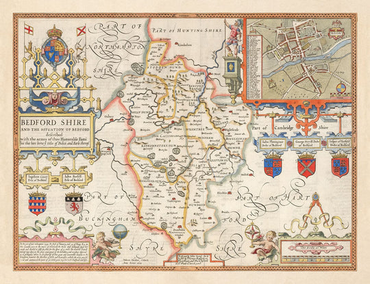 En la esquina superior derecha hay un grabado detallado de Bedford, la ciudad del condado. Como muchos de los mapas de Speed, también hay los escudos de armas de los Condes de Bedford.