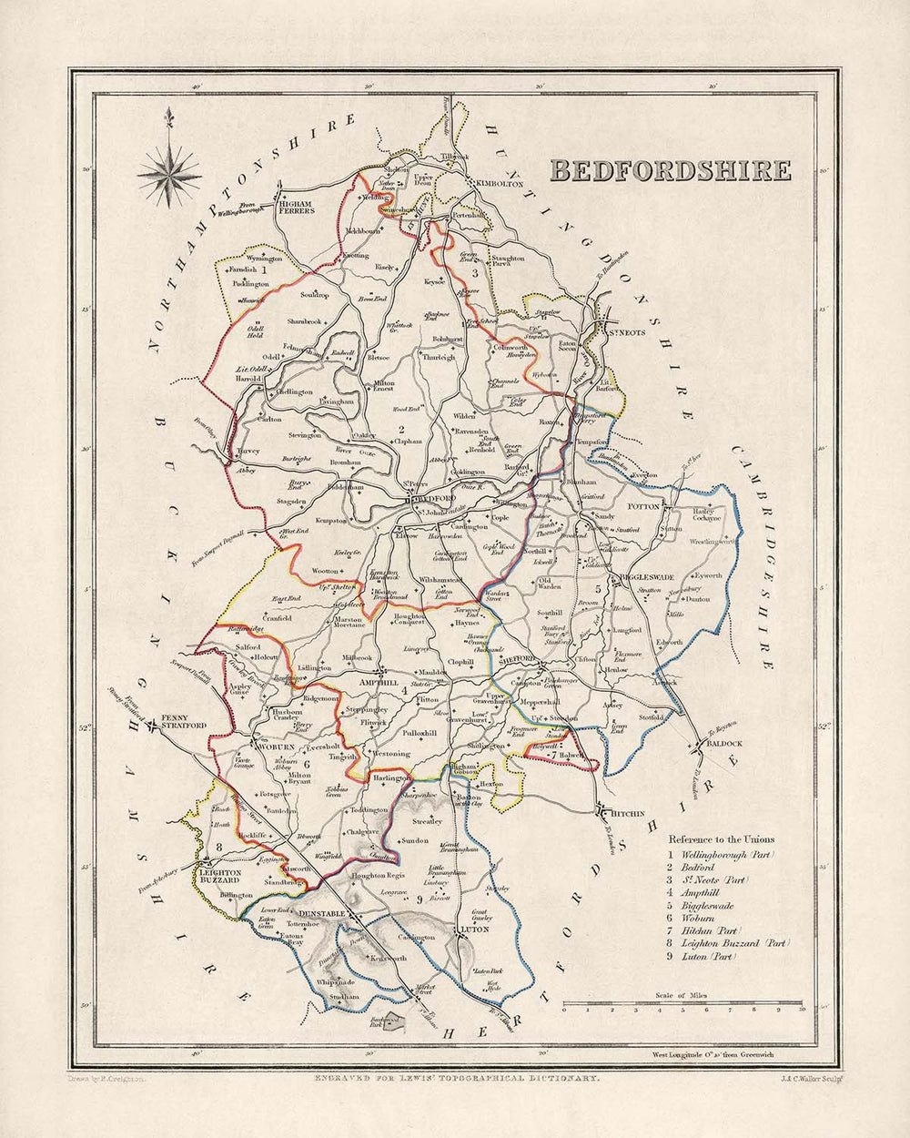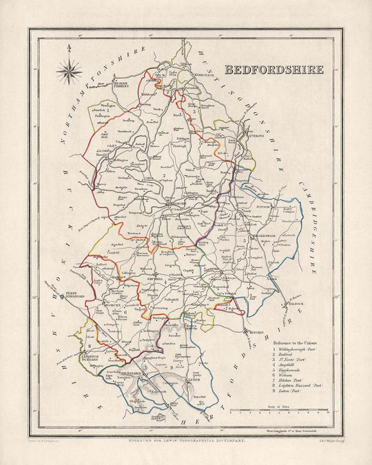 El antiguo mapa de Bedfordshire de Samuel Lewis en 1844 es una pieza cautivadora e históricamente significativa que ofrece una mirada al pasado. Este mapa meticulosamente elaborado muestra el condado de Bedfordshire, Inglaterra, durante una época de grandes cambios y desarrollo. Presenta una oportunidad única para explorar la rica historia de la región, así como la evolución de sus pueblos y ciudades.