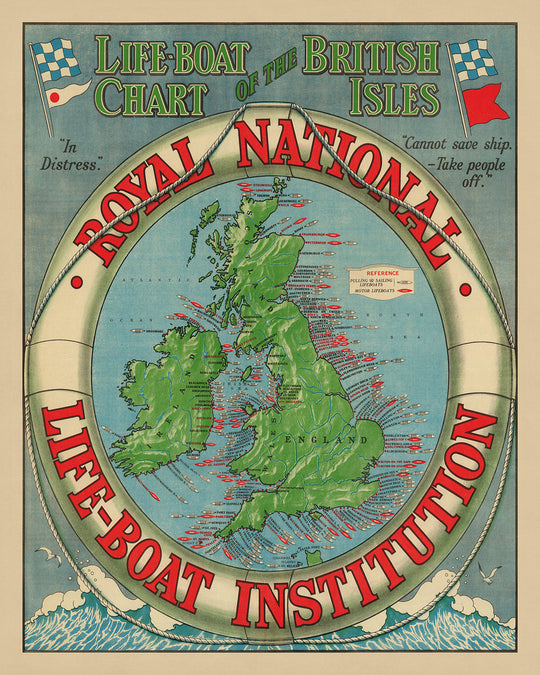 El diseño del mapa es a la vez simple y evocador, presenta un fondo azul que refleja la vasta extensión del mar, mientras que el texto en rojo y negro resalta las ubicaciones de las estaciones de botes salvavidas con claridad y precisión. Cada estación está marcada con el ícono de un pequeño bote, una representación simbólica de esperanza y rescate ante la angustia. El borde decorativo, adornado con una cuerda y un salvavidas, enmarca la carta, añadiendo un toque de elegancia y enfatizando el enfoque temático del mapa en la seguridad marítima y las operaciones de rescate.