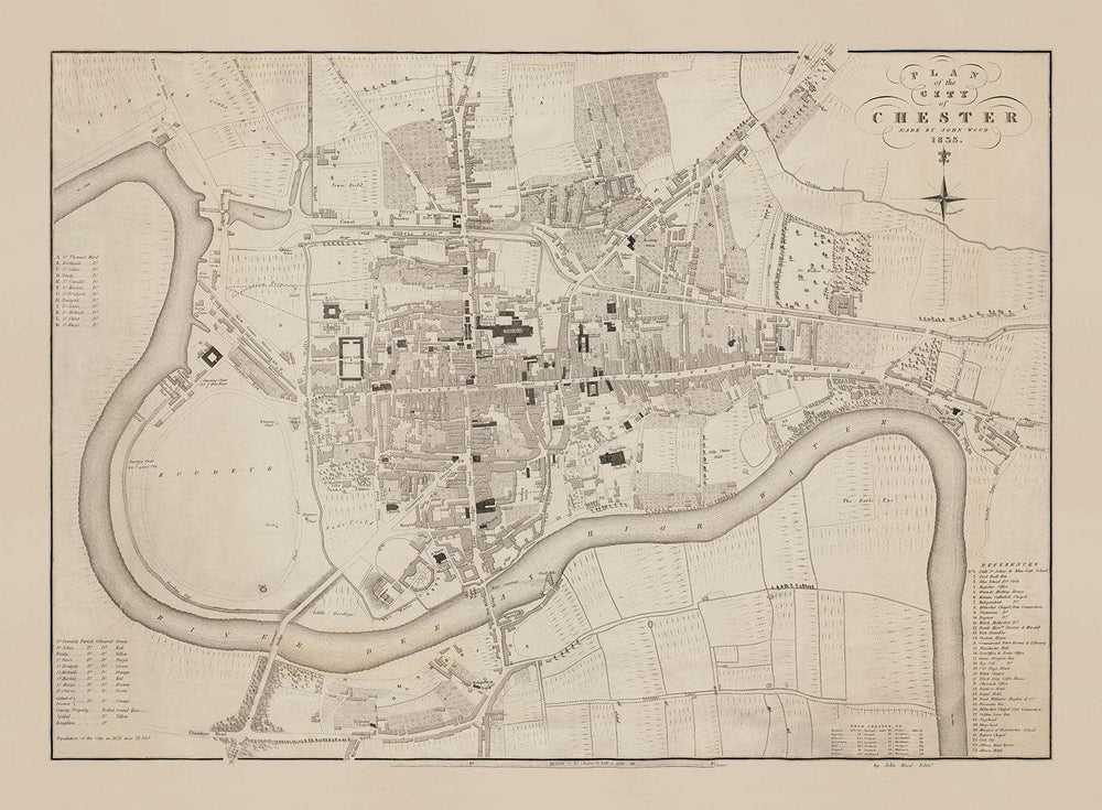 Este antiguo y extremadamente raro plano de la ciudad por John Wood en 1833 muestra la ciudad de Chester en el noroeste de Inglaterra, cerca de la frontera con Gales.