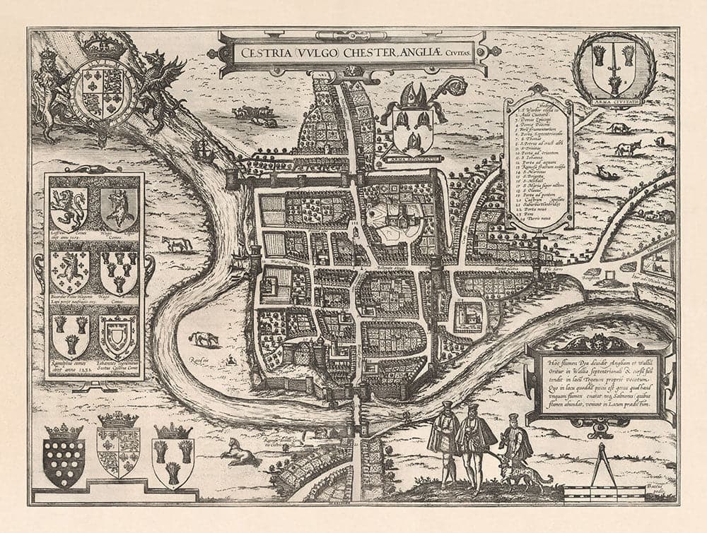 Mapa antiguo de Chester, Cheshire 1581 por Georg Braun: Castillo, Catedral, Murallas de la ciudad romana