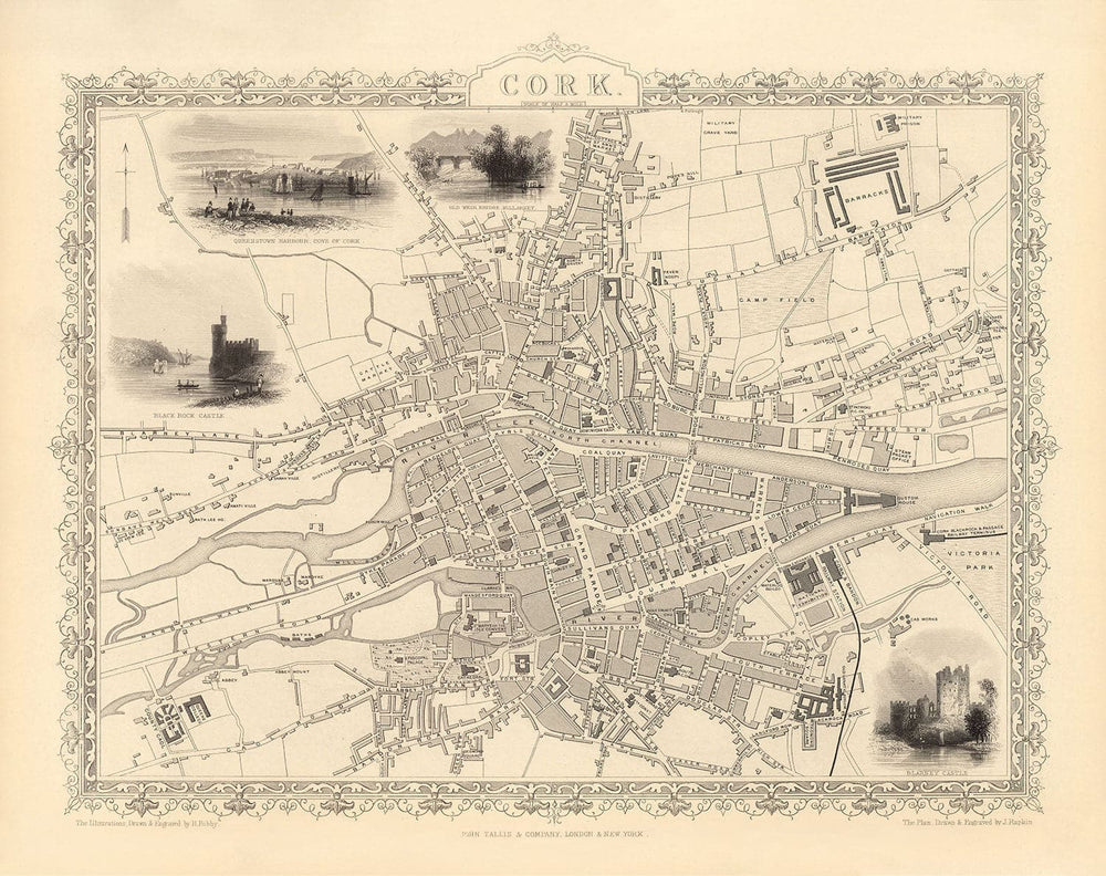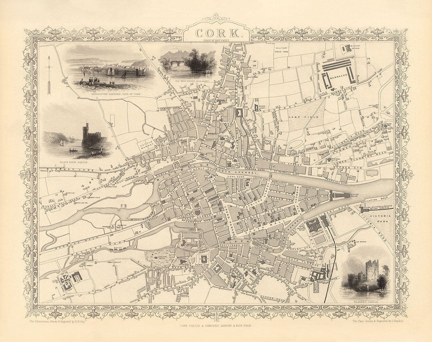 Alrededor de los bordes del mapa hay grabados detallados de edificios y monumentos prominentes en Cork, incluyendo el Castillo de Black Rock y el Castillo de Blarney.