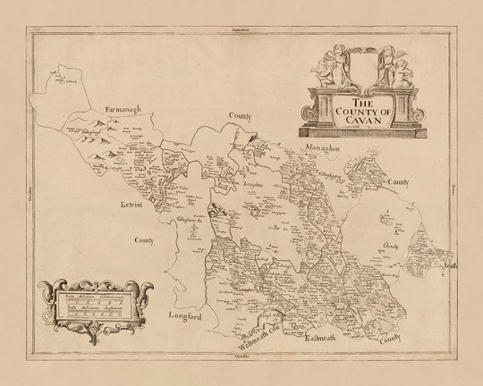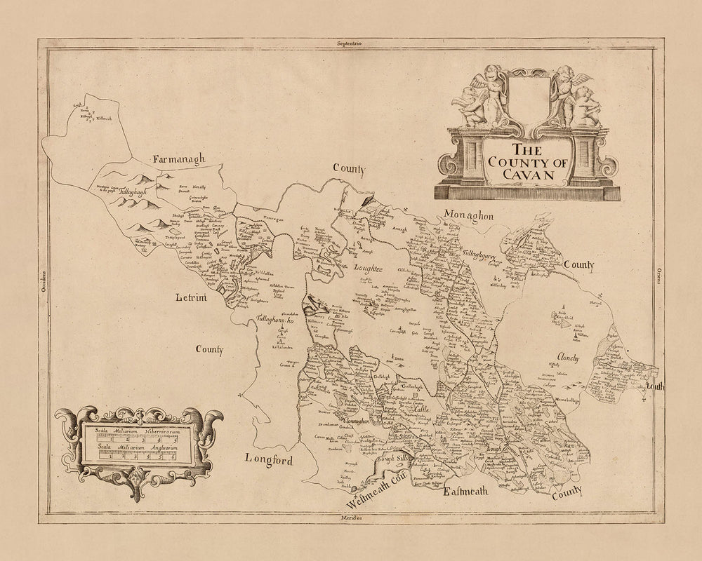 Este mapa del condado de Cavan, publicado en 1685 por Sir William Petty, es un mapa político y físico detallado que proporciona una gran cantidad de información sobre el condado a finales del siglo XVII. El mapa se basa en el Down Survey de Irlanda, el primer estudio territorial detallado a escala nacional en cualquier parte del mundo, que se llevó a cabo entre 1656 y 1658. El mapa de Petty es una versión a escala reducida del Down Survey original, pero aún así se las arregla. para capturar una impresionante cantidad de detalles.