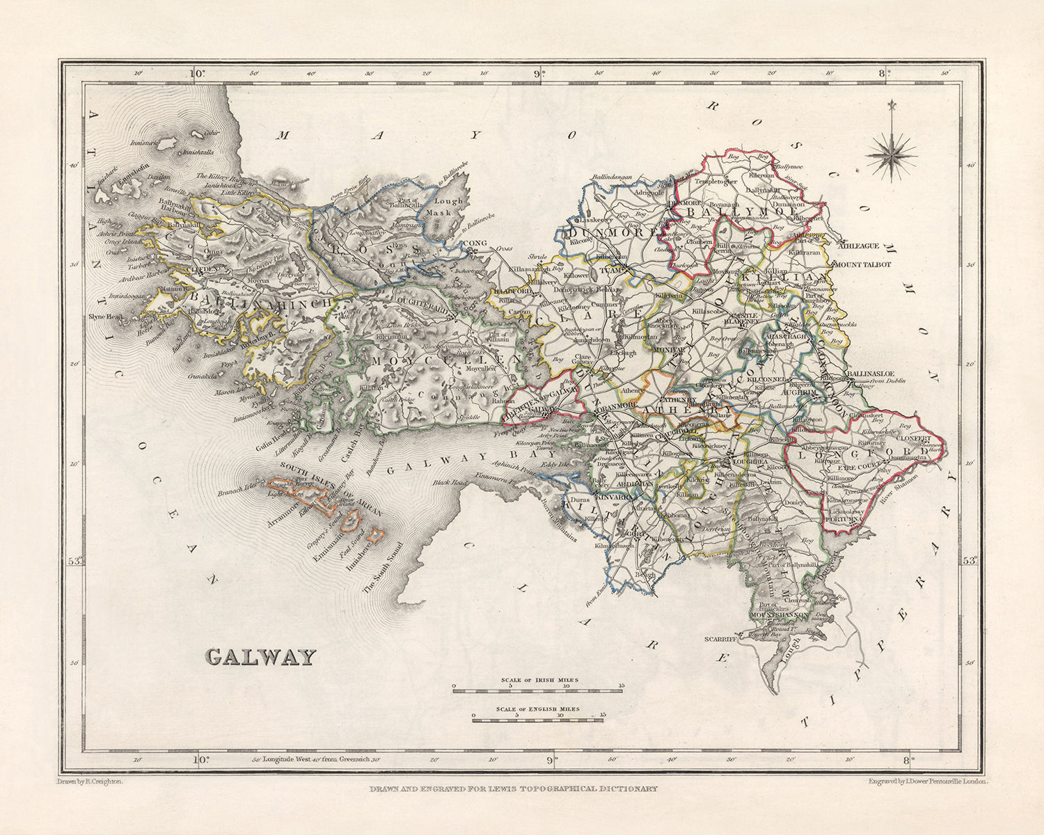 Mapa antiguo del condado de Galway por Samuel Lewis, 1844: Atenas, Ballinasloe, Clifden, Gort, Loughrea