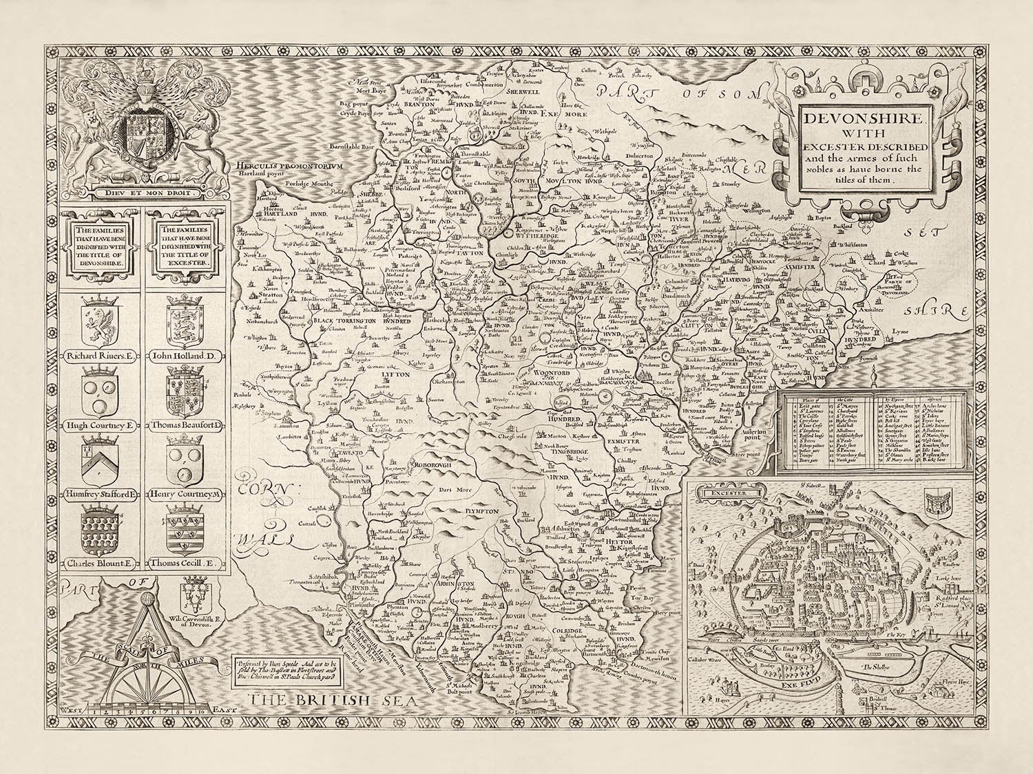 En la esquina inferior derecha hay un grabado detallado de Exeter, que entonces (y todavía) era la capital de este antiguo condado.