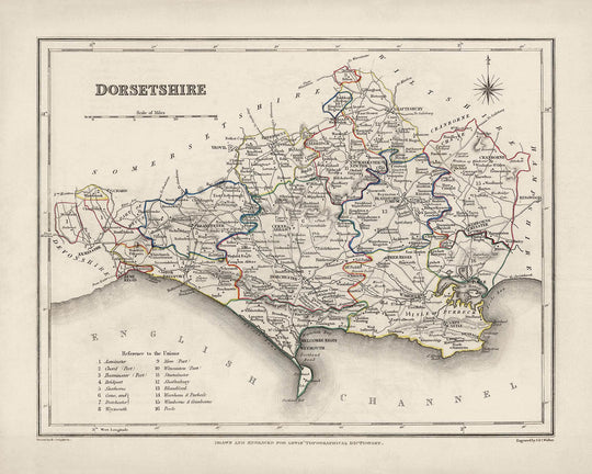 Sea dueño de un pedazo de historia con este mapa antiguo de Dorset de Samuel Lewis, 1844. Sumérgete en el rico patrimonio del condado y maravíllate con los intrincados detalles que dan vida a este mapa histórico.