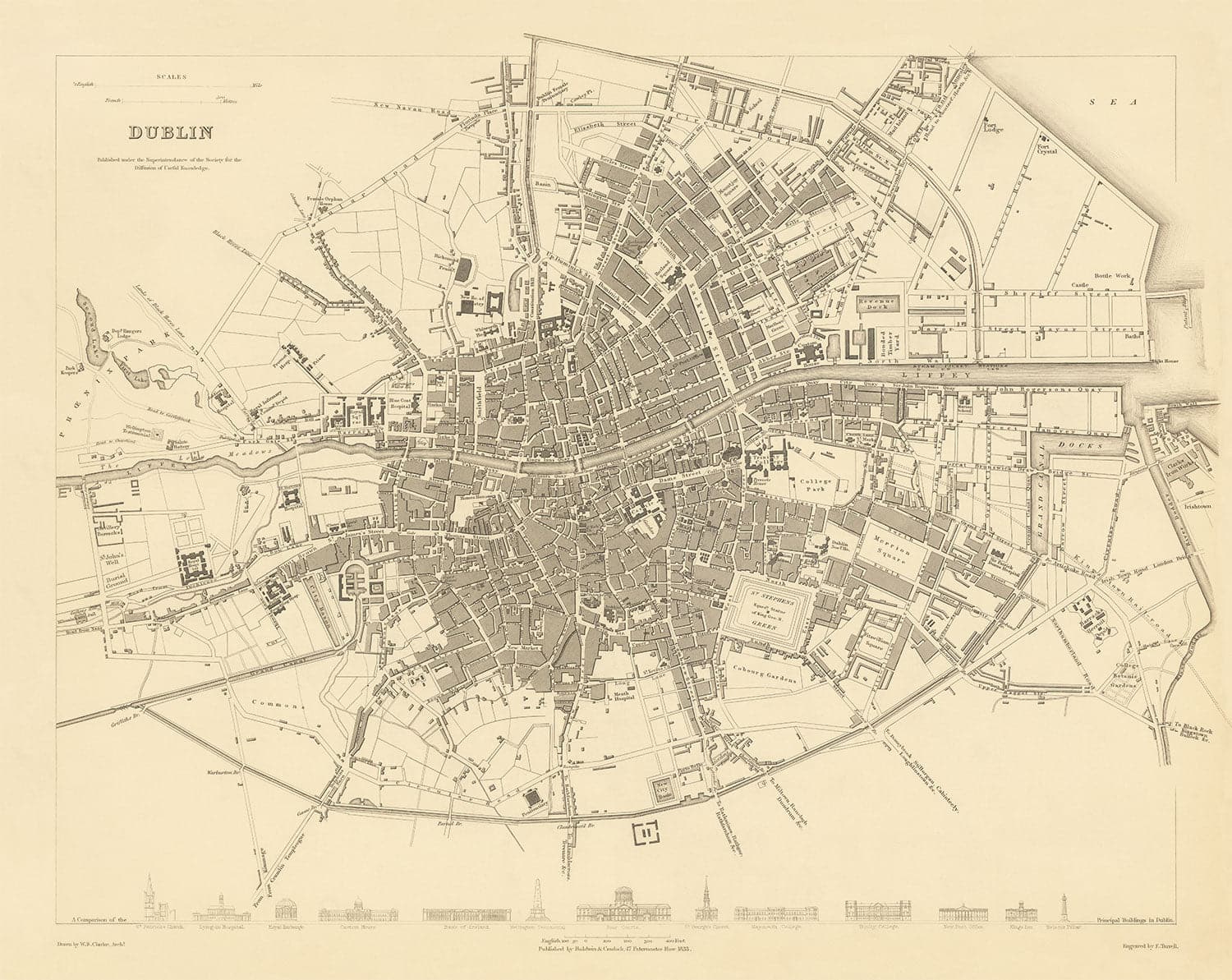 Este raro mapa del centro de Dublín fue dibujado por W.B. Clarke y publicado por Baldwin y Cradock Maps en 1834 para la Sociedad para la Difusión del Conocimiento Útil.