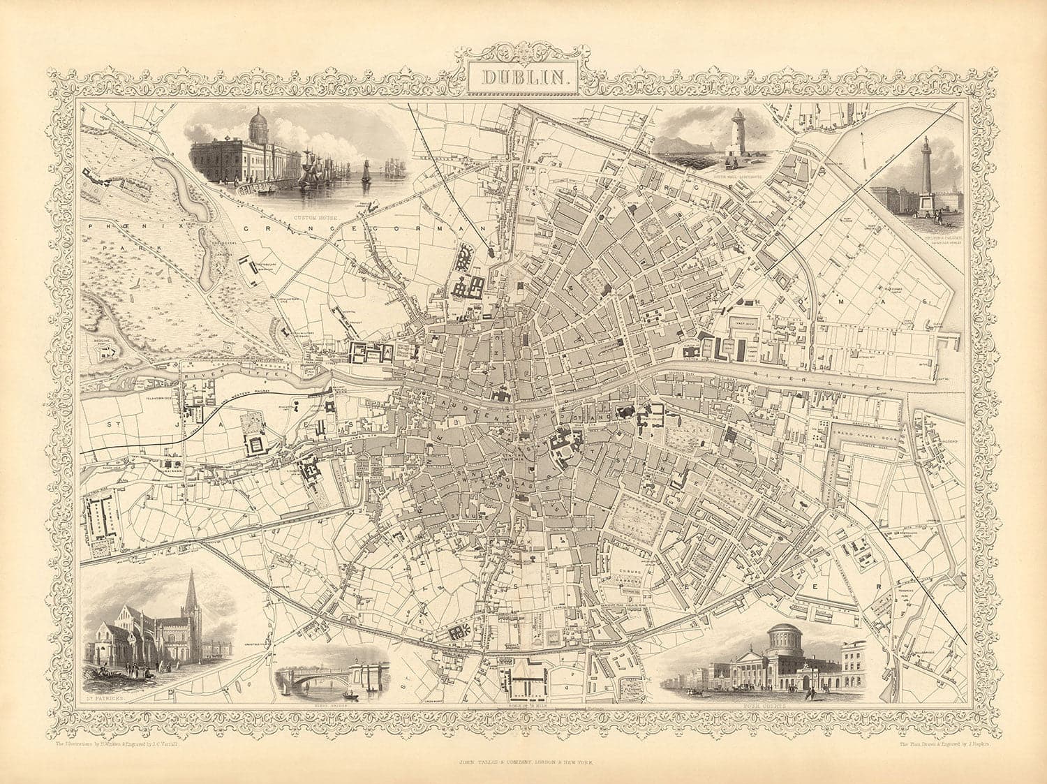 Alrededor de los bordes del mapa hay grabados detallados de edificios y monumentos prominentes en Dublín, incluyendo la Custom House, los Four Courts y el Kings Bridge.