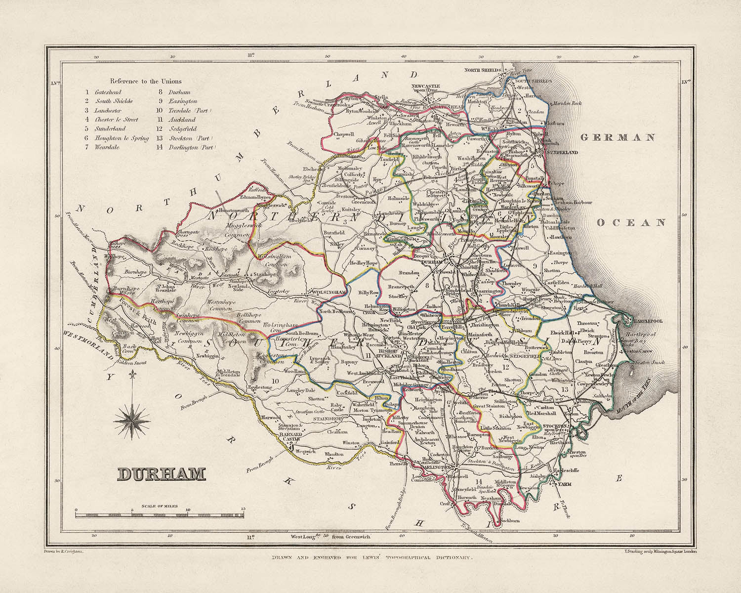 Mapa antiguo de Durham por Samuel Lewis, 1844: Sunderland, Stockton-on-Tees, Hartlepool, Bishop Auckland, Darlington
