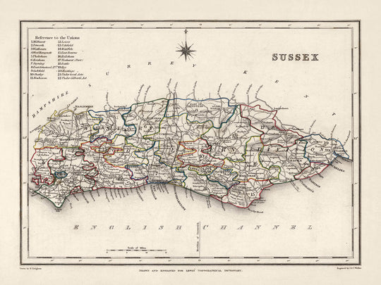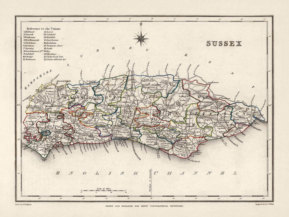 Mapa antiguo de East y West Sussex por Samuel Lewis, 1844: Brighton, Crawley, Worthing, Eastbourne y Hastings