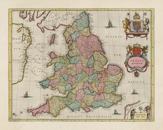 Antiguo mapa de Inglaterra y Gales en 1665 por Joan Blaeu: Carta rara con condados antiguos