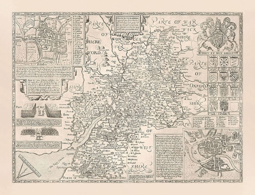 Muchas de las ciudades, pueblos y aldeas en Gloucestershire ya son visibles en este mapa. En 1611, Gloucestershire era un poco más grande. Hoy en día, South Gloucestershire y Bristol se han separado, y algunos de los tramos del norte se han convertido en Warwickshire.