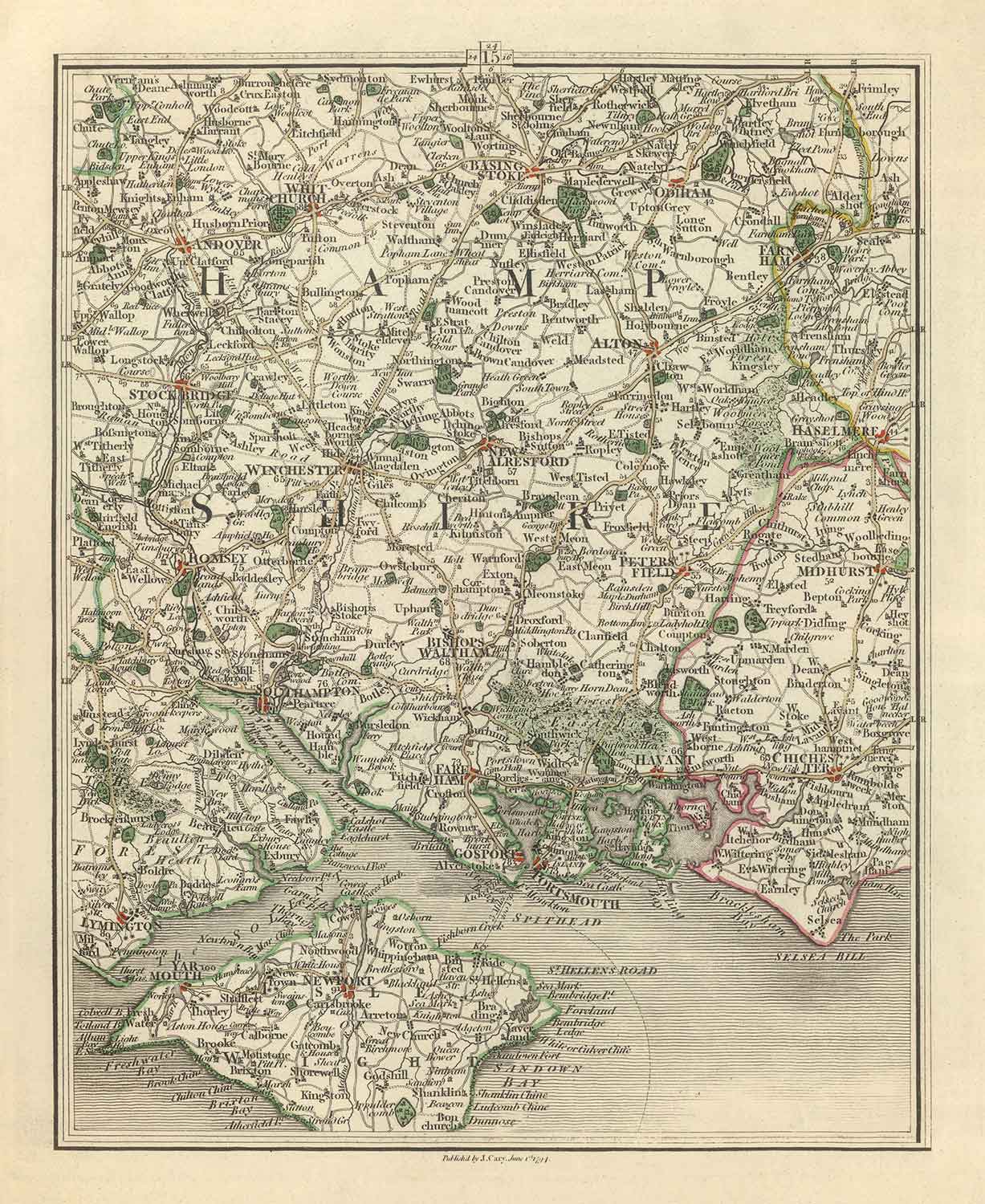 Esta maravillosa antigua mapa de Hampshire e Isla de Wight fue publicada originalmente en 1794. Fue creada por John Cary.