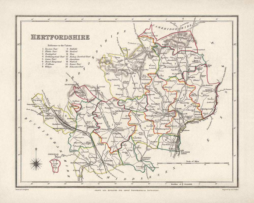 Este antiguo mapa de Hertfordshire de Samuel Lewis en 1844 es una pieza cautivadora de la historia cartográfica que ofrece una mirada al pasado. Con sus intrincados detalles y su exquisita artesanía, este mapa es una adición notable a cualquier colección. El mapa muestra el condado de Hertfordshire en 1844, destacando sus principales pueblos, ciudades y otras características interesantes. Proporciona una perspectiva fascinante del paisaje histórico de la región, lo que le permitirá explorar el condado tal como era a mediados del siglo XIX. Es importante tener en cuenta que, si bien es posible que algunas ciudades modernas no aparezcan en este mapa, otras pueden aparecer con nombres anteriores, lo que añade un interesante elemento de descubrimiento. El mapa antiguo de Hertfordshire de Samuel Lewis en 1844 revela una gran cantidad de asentamientos notables que fueron fundados antes de 1840 y ubicados dentro de los límites históricos del condado. Aquí hay 30 de estos asentamientos, ordenados por el tamaño de la población actual, junto con una breve descripción de su importancia y el año en que fueron fundados: