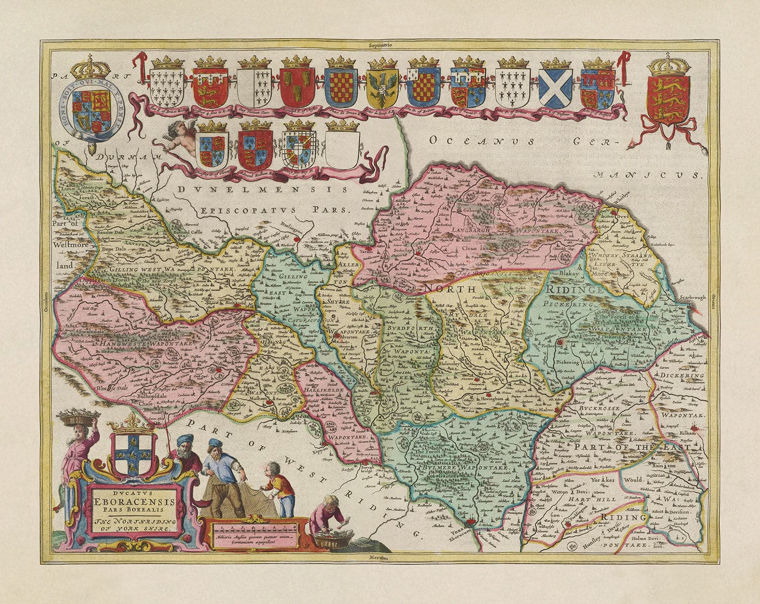 Muchas de las ciudades, pueblos y aldeas en North Yorkshire ya son visibles en este antiguo mapa, incluyendo Middleborough, York, Whitby y Scarborough.