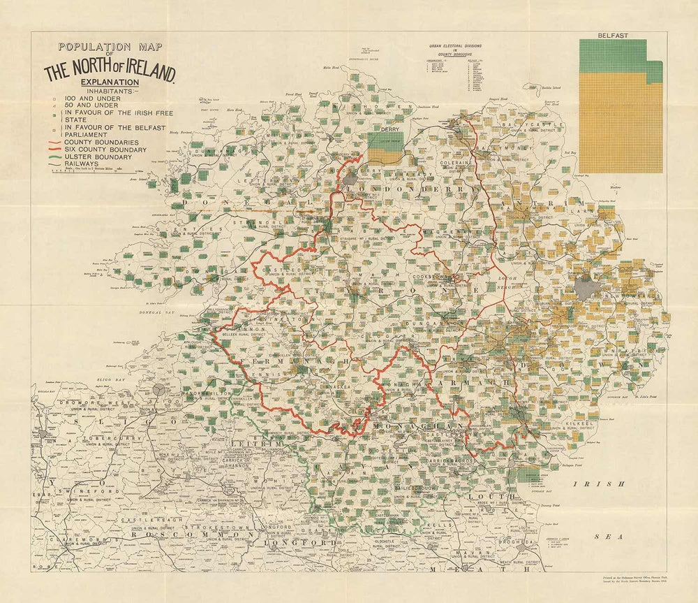 Un mapa extremadamente intrigente e históricamente importante de Irlanda del Norte, capturado por la encuesta de artillería en 1923. El mapa muestra la densidad de población del norte de Irlanda, y su preferencia por un estado libre irlandés o el parlamento de Belfast.