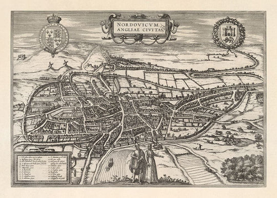 Antiguo Mapa de Norwich, East Anglia 1581 por Georg Braun, Civitates Orbis Terrarum: Castillo, Murallas de la ciudad