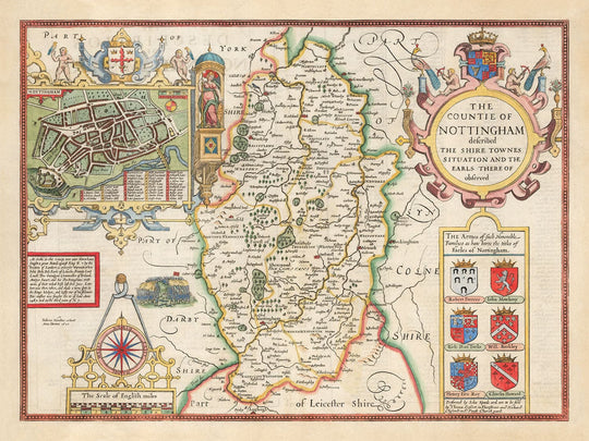 Viejo mapa de Nottinghamshire, 1611 por John Speed - Nottingham, Mansfield, Newark, Worksop