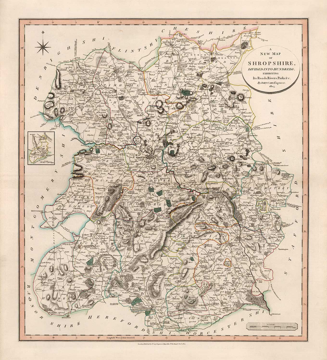 Antiguo mapa de Shropshire en 1805 por John Cary: Shrewsbury, Bridgnorth, Ludlow, Ironbridge, Oswestry