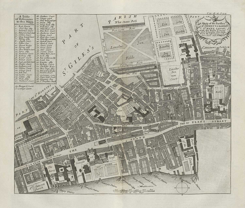 Este mapa de encuesta se centra principalmente en las Parroquias de Santa María Savoy y San Clemente Dane en el distrito de Holborn, donde se pueden ver Lincoln Inn Fields así como el río Támesis en la parte inferior del mapa. Ya puedes ver The Savoy en la parte inferior izquierda del mapa, que en ese momento era una mansión y libertad.
