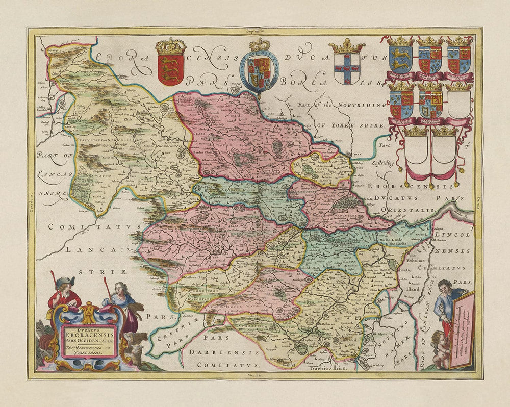Mapa antiguo de West Yorkshire, 1665 de Joan Blaeu: York, Bradford, Sheffield, Leeds, Huddersfield, Halifax, Wakefield