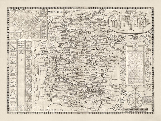 Muchos de los pueblos, aldeas y ciudades en el condado de Wiltshire, en el suroeste de Inglaterra, ya son visibles en este mapa. En la esquina superior izquierda hay un grabado detallado de Salisbury, que entonces (y todavía) era la capital de este antiguo condado. En la esquina superior derecha hay un hermoso grabado de Stonehenge con algunas personas bien vestidas caminando alrededor.