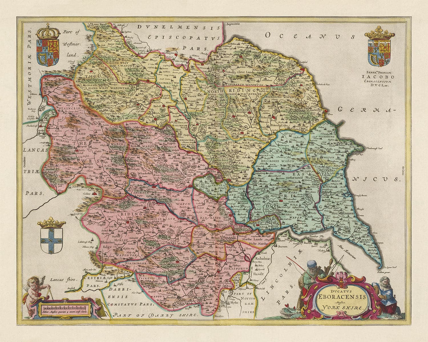 Este es un mapa antiguo de color completo de Yorkshire, extremadamente raro, creado por el maestro cartógrafo Joan Blaeu desde su taller en Ámsterdam y publicado originalmente en este Theatrum Orbis Terrarum Sive Atlas Novus en 1654.