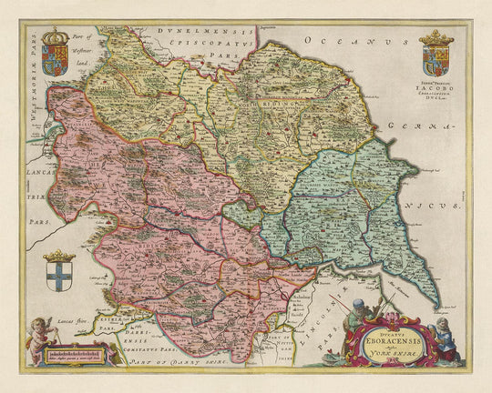 Viejo Mapa de Yorkshire en 1654 por Joan Blaeu: York, Bradford, Sheffield, Leeds, Middlesbrough, Harrogate