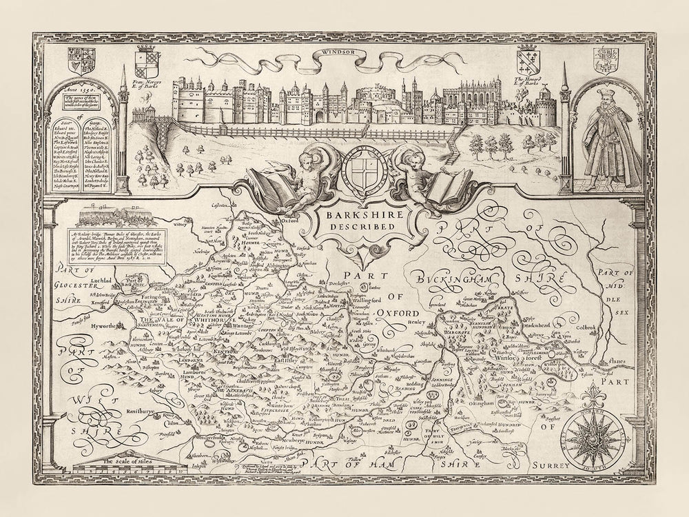 Muchos de los pueblos, aldeas y ciudades en Berkshire ya son visibles en este antiguo mapa, como Newbury y Reading. Pero el centro de atención es Windsor - y de hecho, toda la parte superior del mapa está dominada por un hermoso paisaje del Castillo de Windsor.
