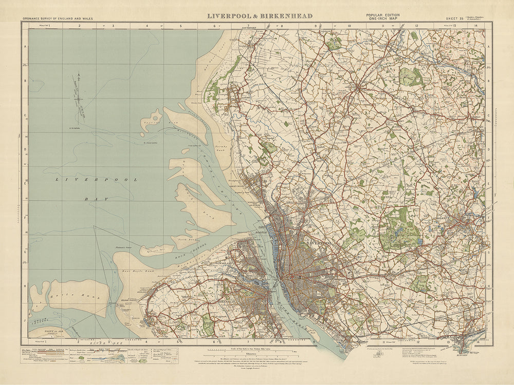 Sumérjase en la historia y geografía de Liverpool, Birkenhead y sus áreas circundantes con este mapa meticulosamente detallado de 1925. Obtenga una comprensión más profunda del pasado de la región, explore sus asentamientos notables y aprecie las características naturales que han dado forma a esta vibrante parte de Inglaterra y Gales.