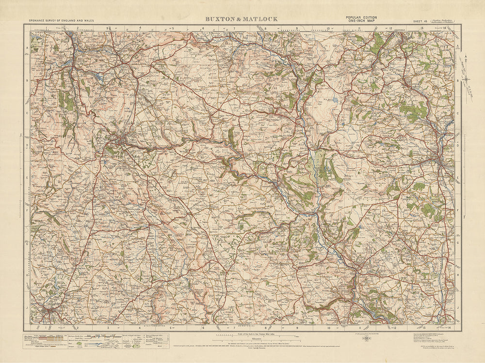 Este notable mapa, titulado "Hoja 45 - Buxton & Matlock", es una pieza auténtica de la edición "Popular" de una pulgada de Inglaterra y Gales del Ordnance Survey, publicada en 1925. Ofrece una visión cautivadora del pasado, mostrando las ciudades. de Buxton y Matlock, así como varios otros asentamientos y características notables. El histórico condado de Derbyshire abarca tanto Buxton como Matlock, lo que hace que este mapa sea un recurso valioso para cualquier persona interesada en la rica historia y geografía de la región.