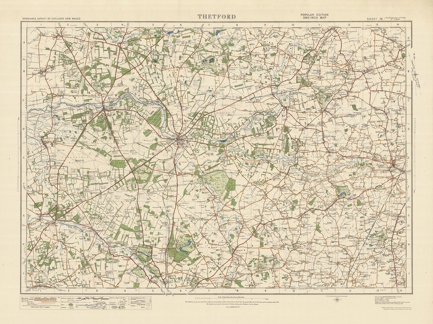 Este antiguo mapa, titulado "Hoja 76 - Thetford", es parte de la edición "Popular" de una pulgada de Ordnance Survey para Inglaterra y Gales, publicada en 1925. Muestra los pueblos, ciudades y características interesantes de Thetford y sus alrededores. áreas. El mapa cubre una extensa región y ofrece una visión fascinante del paisaje y los asentamientos de la época.