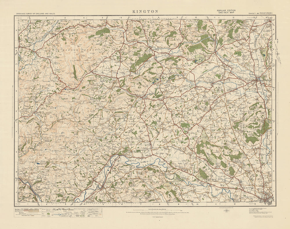 El mapa "Hoja 80 - Kington" de la edición "Popular" de una pulgada de Ordnance Survey, Inglaterra y Gales, publicada en 1925, es una pieza fascinante de la historia cartográfica. Este mapa meticulosamente detallado muestra los pueblos, ciudades y características interesantes de la región, incluidos Kington, Leominster, Hereford, Presteigne, Hay-on-Wye y New Radnor.