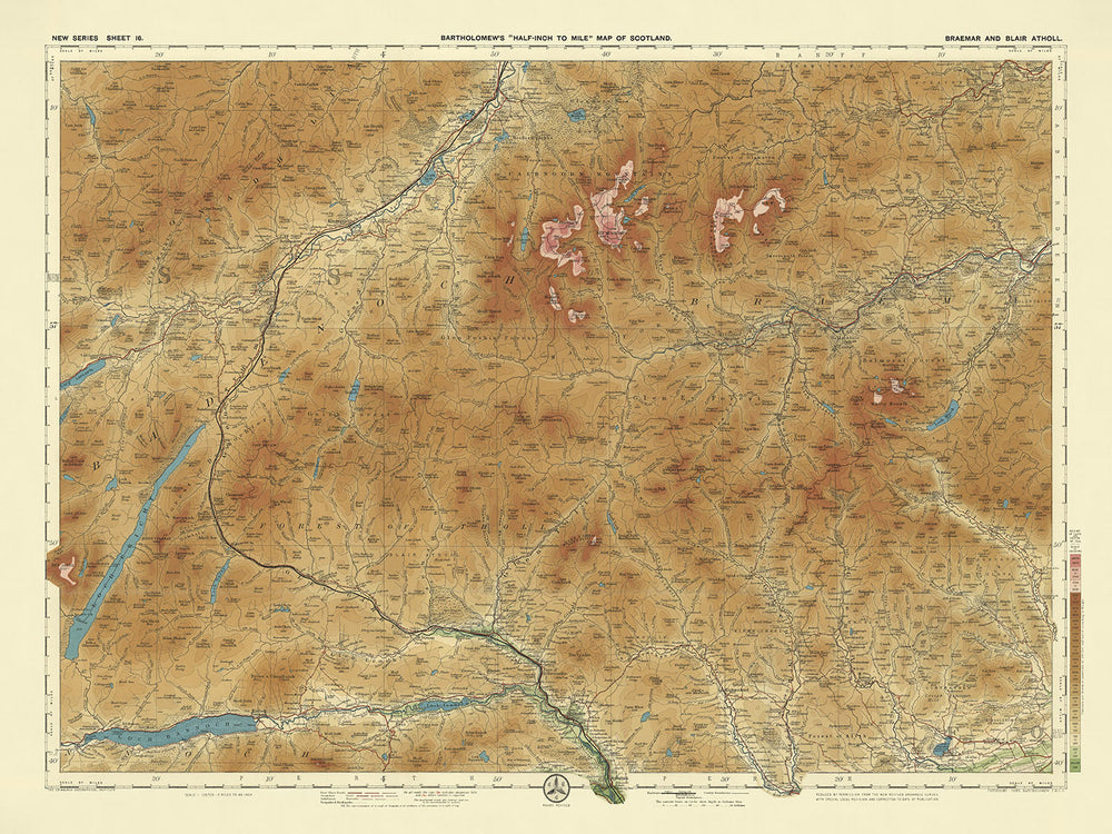 Las ciudades y asentamientos representados en el mapa, incluyendo Braemar, Ballater, Blair Atholl y Pitlochry, proporcionan una instantánea de la vida a principios del siglo XX en las Tierras Altas escocesas. Cada ciudad está cuidadosamente trazada, reflejando el intrincado tapiz social y económico de la región. Este mapa no solo sirve como un valioso documento histórico, sino también como una obra de arte, capturando la esencia de una era pasada con notable claridad y detalle. Ya sea que seas un entusiasta de la historia, un amante de la cartografía o simplemente alguien que aprecia la belleza del mundo natural, "Hoja 16 - Braemar y Blair Atholl" es una pieza atemporal que enriquecerá cualquier colección.