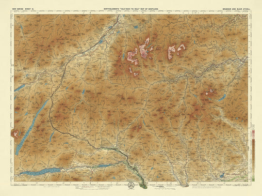 Adéntrese en el cautivador mundo de la cartografía de principios del siglo XX con "Hoja 16 - Braemar y Blair Atholl", una creación exquisita del renombrado cartógrafo escocés J.G. Bartholomew. Elaborado en 1901, este mapa es un testimonio de la maestría de Bartholomew en la fusión de la elegancia artística con la precisión geográfica. Conocido por su uso innovador del color para representar el relieve del paisaje, el trabajo de Bartholomew en este mapa muestra una sutil gradación de tonos para representar las diversas elevaciones de las Tierras Altas escocesas, ofreciendo una representación visualmente impresionante e informativa de la región.