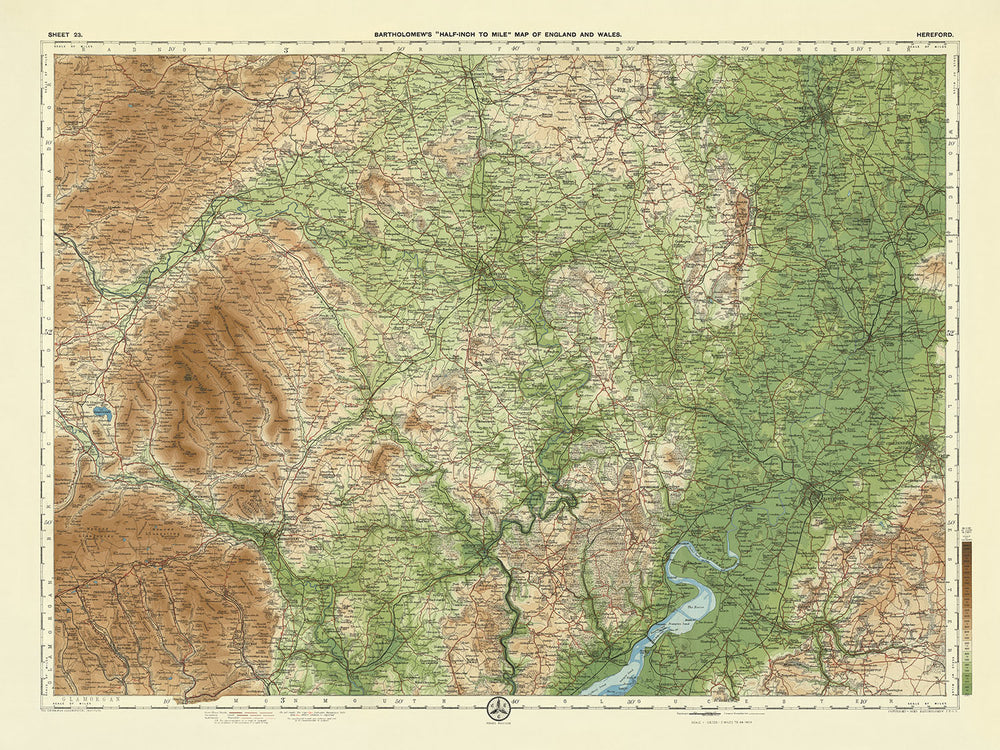 "Hoja 23 - Hereford," creada por el estimado cartógrafo JG Bartholomew en 1901, es una obra maestra de la cartografía de principios del siglo XX. Bartholomew, conocido por sus mapas innovadores y detallados, elaboró este mapa a escala de media pulgada por milla (1:126,720) pensando en ciclistas y turistas. La claridad, atractivo y colores vibrantes del mapa lo convirtieron en una serie insignia para Bartholomew, y sigue siendo una pieza preciada para coleccionistas y entusiastas de la historia. Este mapa en particular ofrece una representación política y física detallada de Herefordshire y sus regiones circundantes, proporcionando una ventana al paisaje y la infraestructura de las Islas Británicas hace más de un siglo.