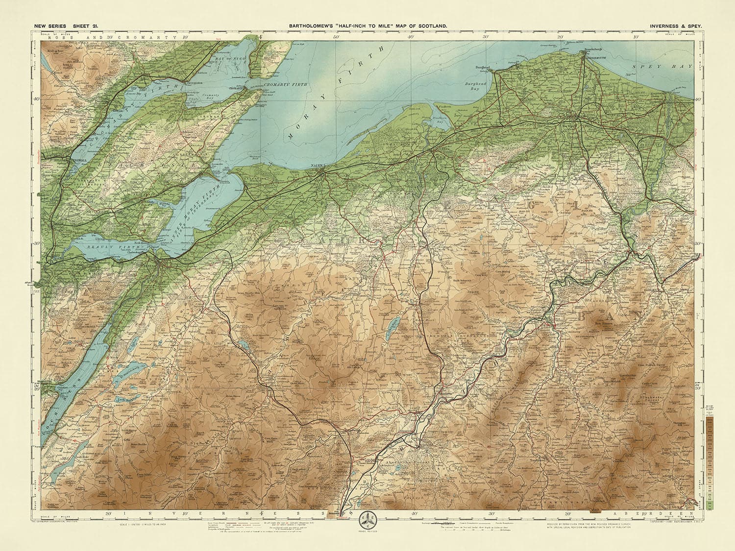 El mapa abarca una amplia gama de características geográficas, desde las serenas aguas del lago Ness y el lago Morlich hasta los caudalosos ríos como el río Spey y el río Ness. La belleza costera de Moray Firth y Cromarty Firth también se muestra de manera destacada, invitando a los espectadores a explorar los intrincados detalles de los paisajes naturales de Escocia. El diseño del mapa no es sólo un deleite visual sino también una guía funcional, que refleja el creciente interés por las actividades al aire libre y el turismo a principios del siglo XX.