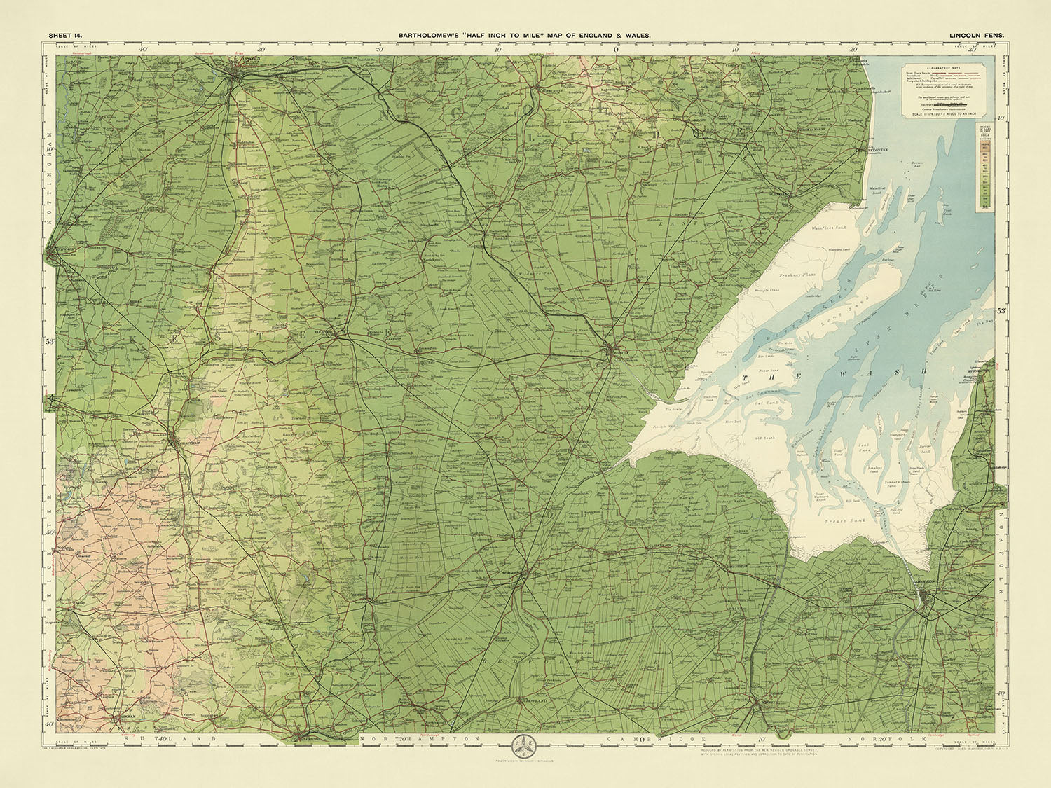 La importancia histórica de "Hoja 14 - Lincoln Fens" se extiende más allá de su precisión geográfica. Captura un momento en el tiempo cuando la región estaba experimentando cambios significativos, tanto en términos de infraestructura como de gestión del paisaje. El diseño y estilo del mapa, caracterizados por su clara delimitación de características físicas y políticas, reflejan la excelencia cartográfica de JG Bartholomew. Este mapa no es solo una ayuda de navegación, sino una pieza de historia, ofreciendo un vistazo al pasado y a los intrincados detalles que dieron forma a los Lincoln Fens.