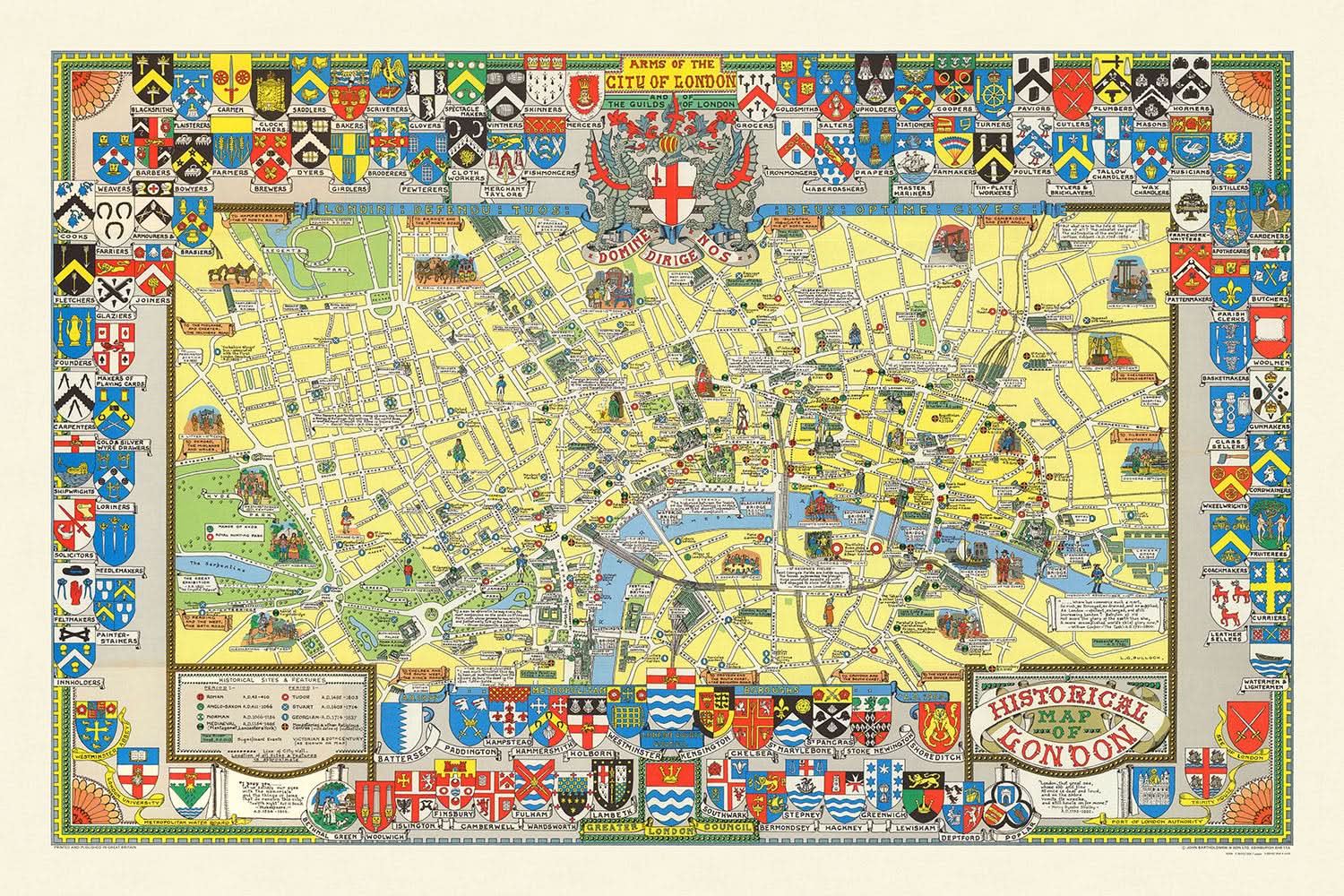 El trabajo de LG Bullock es un testimonio del arte y la habilidad de la cartografía, que combina la precisión histórica con el atractivo estético. Este mapa no solo sirve como herramienta de navegación, sino también como una obra de arte que celebra el rico patrimonio de Londres. Sus elementos temáticos y pictóricos lo convierten en una incorporación única a cualquier colección, ofreciendo una ventana al pasado y una apreciación más profunda del legado perdurable de la ciudad.