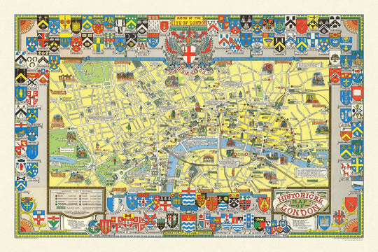 Este mapa es un tesoro de los monumentos históricos de Londres, con ilustraciones de la Torre de Londres, la Catedral de San Pablo y la Abadía de Westminster. Cada monumento está representado meticulosamente, lo que ofrece un recorrido visual por las maravillas arquitectónicas de la ciudad. Estas estructuras icónicas no solo son importantes por sí mismas, sino que también sirven como símbolos perdurables del pasado histórico de Londres, lo que hace que este mapa sea imprescindible tanto para los entusiastas de la historia como para los coleccionistas.